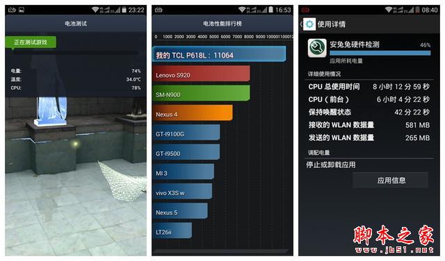然后杰里米在晚上23.22时,用安兔兔硬件测试开始测试电池,这时电池剩74。 到第二天早上8.40 电池剩12。相当于连续运行8小时(屏幕不灭,进行游戏、看网页、看视频等)TCL P618L仅掉电62, 这数据太吓人了!你们被吓到了吗? 这真是不折不扣的续航王。