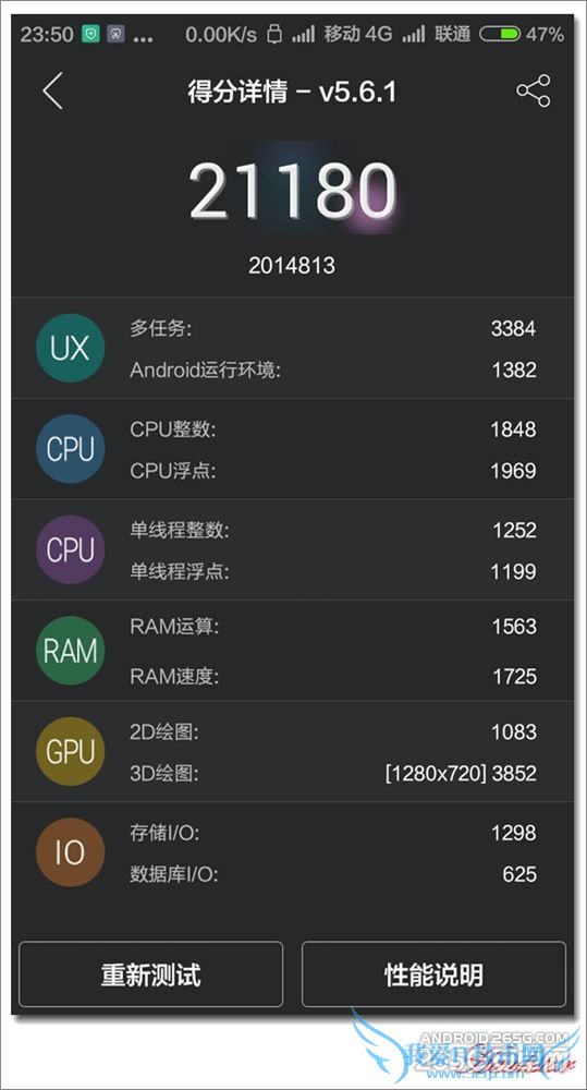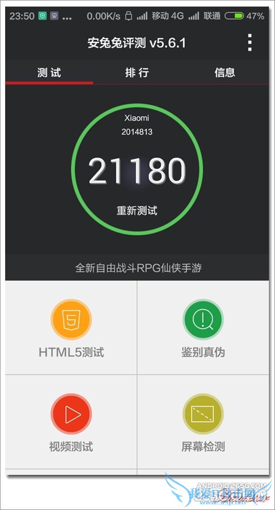 安兔兔跑分 红米1代 跑分大概19000 这个21000多 算是进步了。