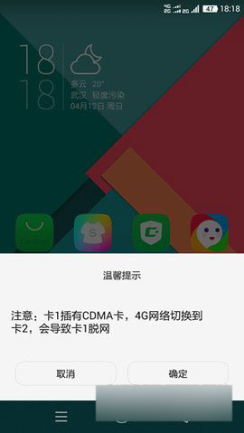 不过我们可以选择一个折中的办法,即当系统提示“卡1插有CDMA卡,4G网络切换到卡2,会导致卡1脱网”的时候,不要点“确定”,而选择“取消”。
