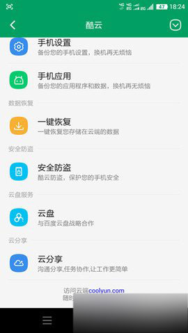 通过手机自带的“酷云”应用,则可以方便的将通讯录、日历、照片,甚至手机应用保存在云端。这样一来即使在刷机双清系统之后,手机中的内容也不会丢失。另外 “酷云”应用也提供了一键恢复的等功能,手机刷机或者恢复出厂设置之后,只需要使用一键恢复,就可以将之前保存在云端的数据重新下载到手机当中。