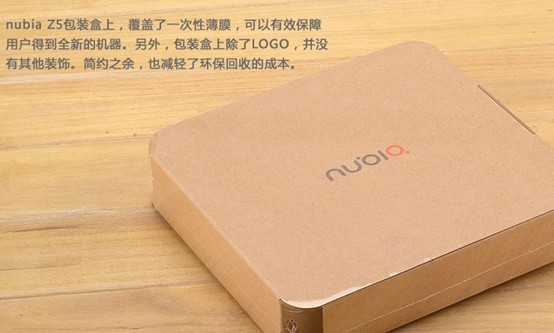 外观方面,Nubia Z5包装盒上,覆盖了一次性薄膜,可以有效保障用户得到全新的机器。另外,包装盒上除了LOGO,并没有其他装饰。简约之余,也减轻了环保回收的成本。