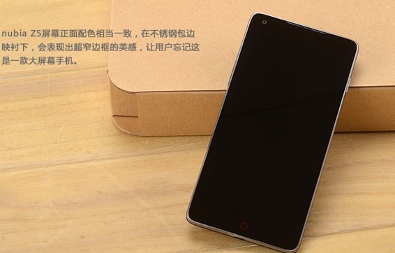 nubia Z5屏幕正面配色相当一致,在不锈钢包边映衬下,会表现出超窄边框的美感,让用户忘记这是一款大屏幕手机。