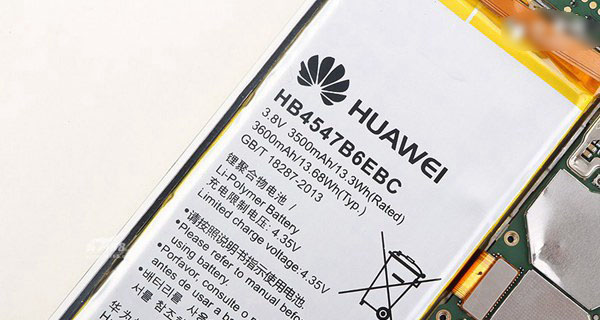 图为拆解下来的荣耀6 Plus电池特写,其搭载了3600mAh超大容量电池,在目前5.5英寸大屏手机中,荣耀6 Plus算是电池容量最大的一款,另外还结合荣耀省电技术,续航方面无疑也是荣耀6 Plus一大亮点。