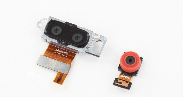 图为拆卸下来的前置单800万像素摄像头和后置双800万像素摄像头特写,荣耀6 Plus共有三个摄像头,这在目前智能手机中,也是创新之举,也是整机的最大看点。