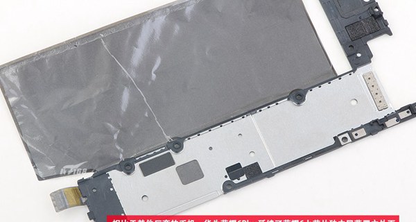 相比于其他厂商的手机,华为底部方面延续了荣耀6上芯片独立屏蔽罩之外再增加一块一体式固定罩的设计,这种设计主要是出于稳定性考虑。我们可以看到这块一体式固定罩采用金属和塑料注塑而成,金属部分紧贴芯片,能够很好的将芯片的热量传导出来,而表面贴有大面积的石墨散热贴纸,用于物理散热。