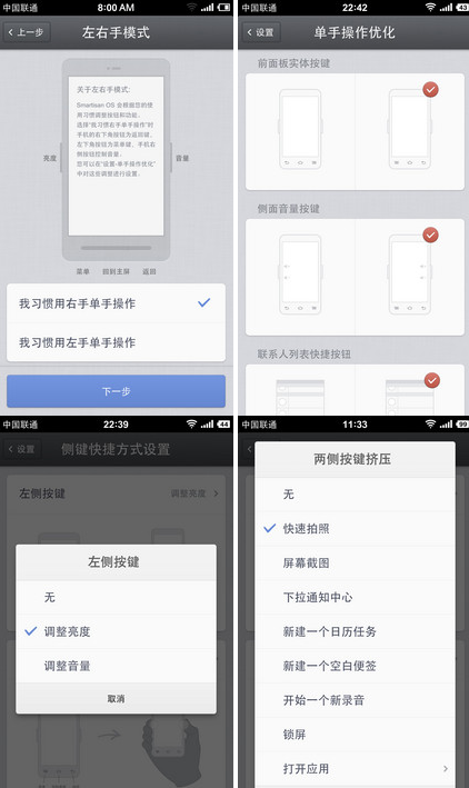 在操作手机时我们每个人的惯用手是不同的,而Smartisan OS支持用户根据惯用手的不同来自定义手机实体按键的功能,在初次使用手机时系统会提示用户切换左手或右手模式,并且在设置界面当中也可以随意更改。都满足了习惯了左手和右手的用户。