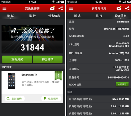 笔者要在这里值得一提的是,尽管各家媒体有关锤子手机的相关评测文章已经陆陆续续的发布了,但似乎鲜有提及锤子手机的性能测试部分的内容。不过从上面的锤子手机安兔兔跑分来看,配有2.5GHz骁龙801四核处理器的锤子手机跑分表现比较一般,锤子手机安兔兔最总得分成绩为31844分,这或许会让不少“跑分党”颇感有点失望和难过。
