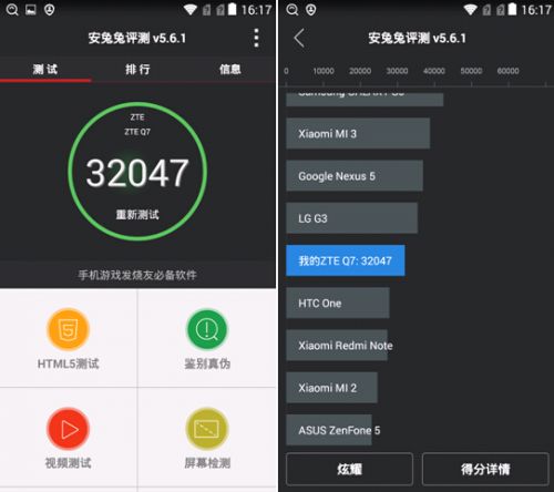 安兔兔性能测试是最常用的测试软件,里面涵盖了内存和闪存、CPU、图形、SD卡读取/写入等测试项目,并给出一个综合性分数。最后得出的分数,基本上能比较准确的表示你的手机属于那一个性能阶梯。在安兔兔跑分测试中,32000多分超过了HTC曾经的旗舰One一大截,作为一款中档手机足够用了,可以保障流畅运行主流应用软件。