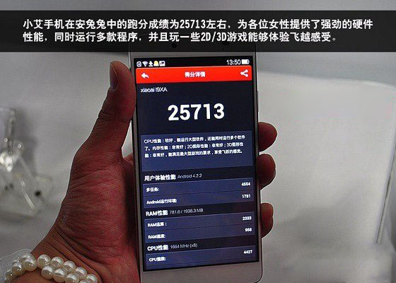 性能方面,小艾手机搭载了1.7Ghz联发科MT6592真八核处理器,运行2G内存以及16G存储内存,通过安兔兔跑分软件检测,可以看出,小艾手机安兔兔跑分达到了25713分,属于中高端性能水平,可以带来各类流畅的应用与游戏体验。
