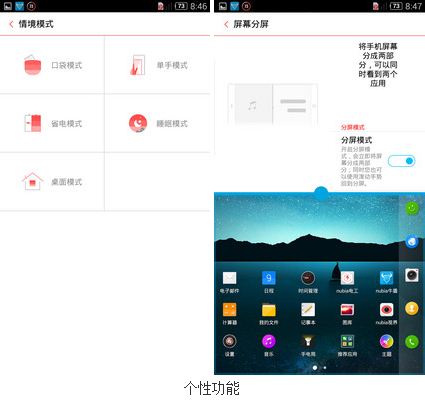 除此之外,nubia UI 2.5还提供了针对大屏利用效率的分屏功能和诸如屏幕投影、红外遥控器、蓝牙寻找手机、智能体感和手势操作等有可能使用到的便捷功能,增加了系统的可用性、可玩性。