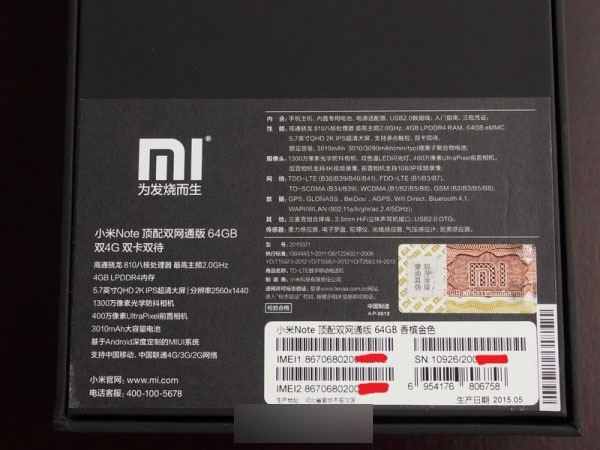 包装背部依然是我们熟悉的配置信息,我们拿到的是小米Note顶配版双网通版64G香槟金色。