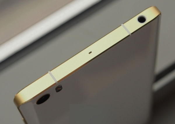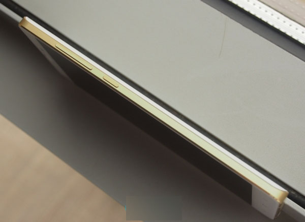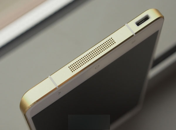 香槟金的小米Note顶配版采用了金色边框设计,天线隔断条是白色的,顶部有3.5mm耳机接口以及降噪麦克风。