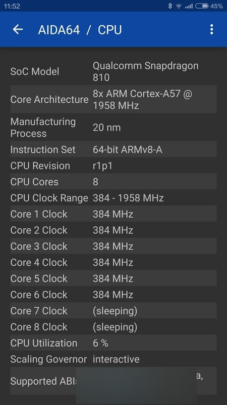 小米Note顶配版搭载的是骁龙810(MSM8994)2.0GHz八核64位处理器,由四核Cortex-A57和四核Cortex-A53组成big.LITTLE架构(图中显示八核A57为识别错误)。CPU步进和G Flex2、Z9 Max等手机一样都是r1p1。