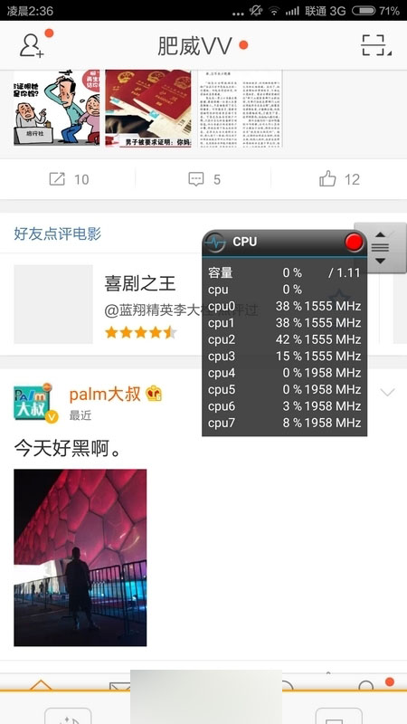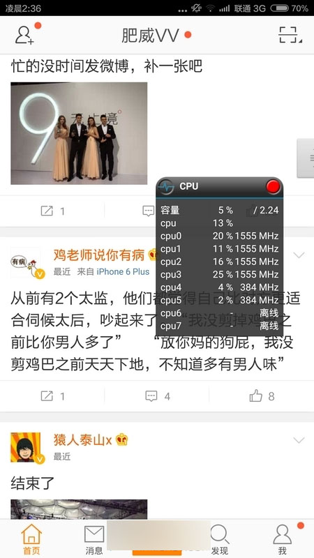 我们打开微博进行测试,可以看出日常应用情况下,小米Note顶配版也有“八核全开”的情况,而且各个CPU核心都维持在较高的频率上。