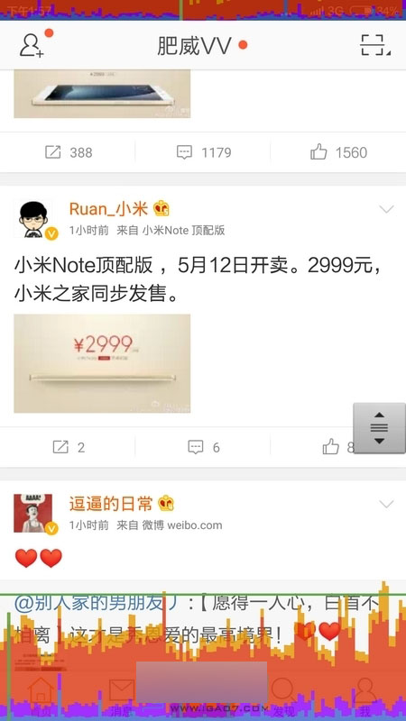 我们打开GPU呈现曲线查看小米Note顶配版运行应用的流畅性,在新浪微博中基本上可以保证滑动流畅。