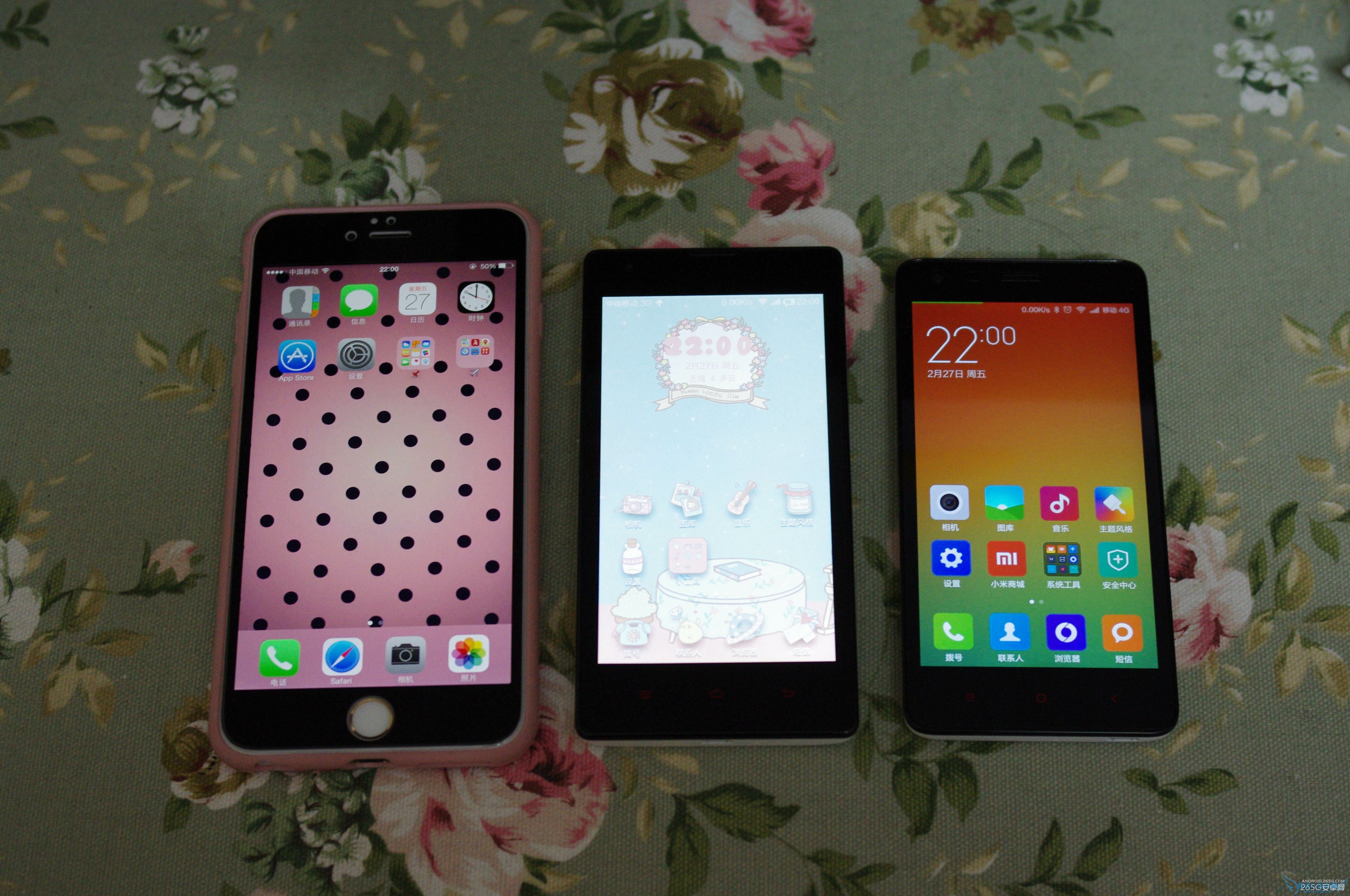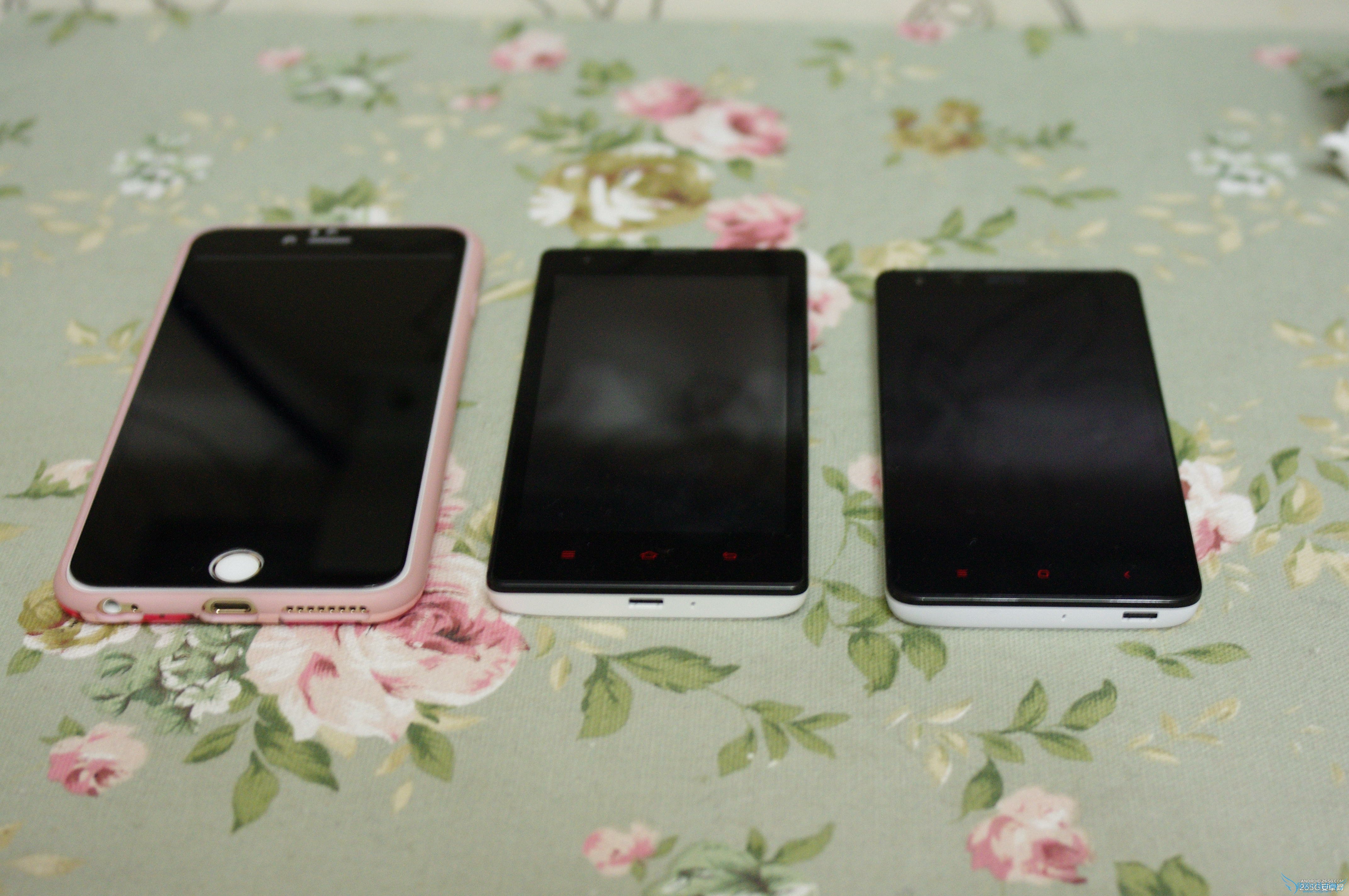从左到右依次苹果6plus,红米1和红米2增强版,看着都蛮顺眼的,哈哈哈。红米2还是要比红米1小上1圈的,重量也轻了,习惯了以前重量的手机,红米2增强版开始拿手里还真有点不适应。