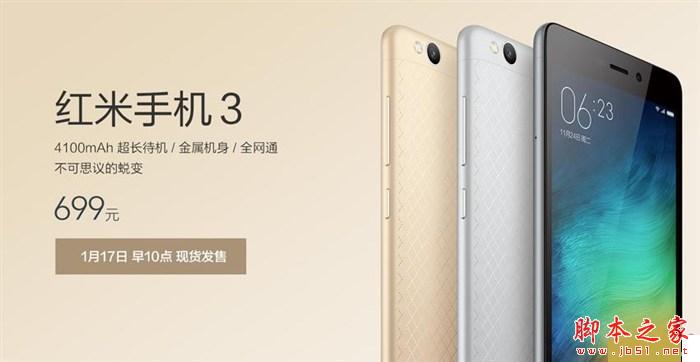 红米3一共有时尚金色、时尚银白、时尚深灰和经典金色四种配色,售价699元,将于1月12日在小米官网(mi.com)、小米天猫旗舰店、小米京东旗舰店、苏宁易购以及全国小米之家同步销售。