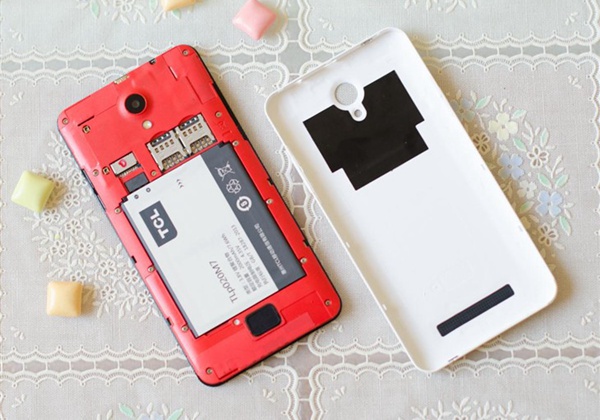 机身的左右两侧分别为音量键和电源键,后盖为可开启设计,内部有石墨散热层。机身中壳也采用红色塑料材质,摄像头下方为 microSD 卡槽与两个 microSIM 卡槽,下方为2000mAh可更换电池。