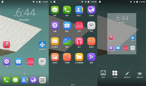 桌面是经典的4 x 4布局,下方有四个程序的快捷方式 Dock ,点击右下角图标可进入程序抽屉栏,长按屏幕空白处能进入编辑页面。“乐玩”对原生系统的图标进行了修改,圆角矩形显得更加统一,风格颇具立体感。