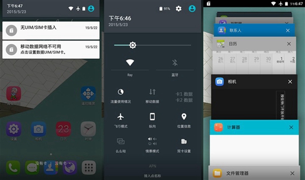 系统的通知栏采用双段式界面,单次滑动显示通知,再次滑动显示快捷设置界面。界面中增加了针对双卡还有情景模式的设置项,更加符合国人操作习惯。而多任务界面则没有改动,仍为 Lollipop 系统的卡片式瀑布流界面,滑动非常流畅自然,任务信息更加直观。