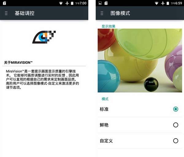 系统设置菜单中提供了一个名为 MIRAVISION 的画面显示技术,可提供不同色彩方案来调整显示屏的显示质量。同时也可以自定义饱和度、亮度和对比度以及动态对比度,达到一个自身能接受的显示效果。