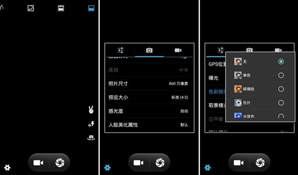 拍照方面,该机配备了800万像素BSI感光元件以及F2.2大光圈镜头,理论上能有比较不错的画质表现。它的相机界面比较简洁,并没有采用功能单一的 Android 原生相机界面,而是添加了一定的滤镜和特效功能,让拍摄更具趣味性。