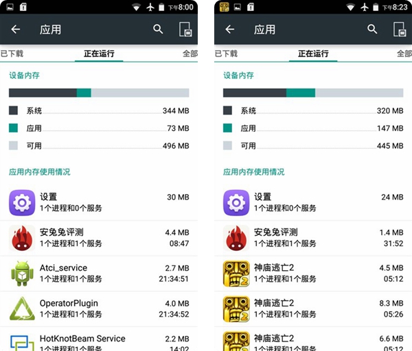 占用的内存如何?我们发现,该机只配备了1GB RAM,但众所周知Android 5.0系统虽然针对小内存机型进行了优化,但目前5.1.1之前的版本存在内存泄漏的问题。而“乐玩”在运行游戏时的可用内存剩余440MB左右,切换多任务时并未发生重载现象,看来优化比较到位。