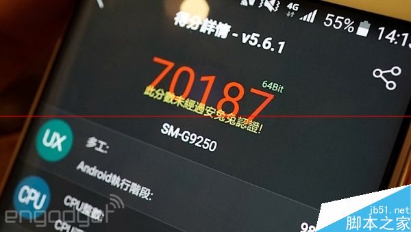 现场进行了一下跑分测试,超过70000分的安兔兔成绩表面S6 Edge使用的14nm Exynos 7420处理器具有极其强大的性能,加上最新的3GB LPDDR4闪存和比较轻量化的TouchWiz界面,如此的性能在今年上半年的旗舰手机之中已经成功拔得头筹。