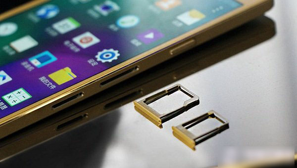 三星A5机身右侧有锁屏按键和两个卡槽,上部的卡槽是TF卡与Micro SIM卡混用卡槽,下方的卡槽则为SIM卡槽,该机支持移动/联通双4G网络。