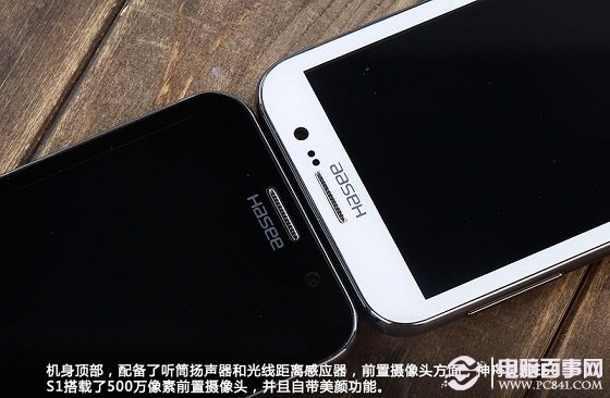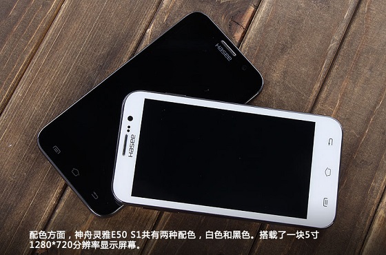神舟E50才用了5英寸720P高清IPS屏幕,从正面外观上,该机显得中规中矩,采用了比较时尚的圆边角机身设计,正面顶部有前置有醒目的听筒、Hasee品牌标识以及500万像素前置摄像头等等,如下图所示: