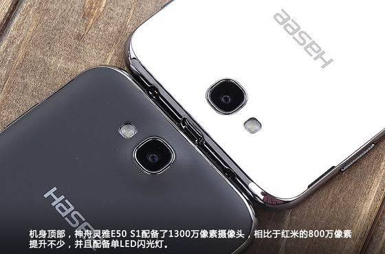 机身背面方面,神舟E50后置1300万像素摄像头,并配备LED闪光灯,相比搭载800万像素的红米与荣耀3C手机而言,后置的摄像头水准更高,如下图所示。