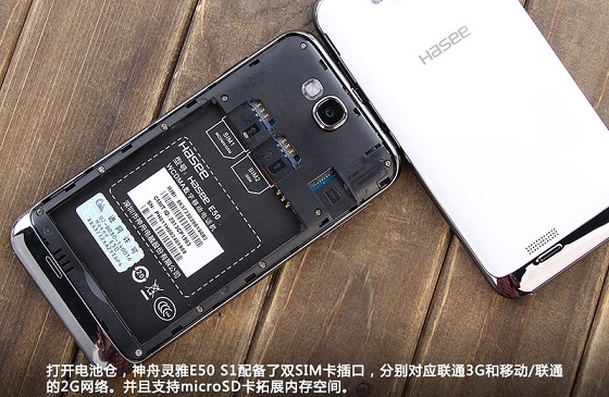 机身内部方面,神舟E50内部拥有双SIM卡槽,并且还有SD扩展卡存卡槽。神舟E50支持双卡双待,拥有两种网络版本,其中神舟E50 S1支持联通3G+GSM双卡双待,而神舟E50 T1支持的是移动3G+GSM双卡双待。