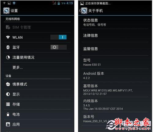 神舟E50系统的设置界面也类似于原生安卓4.2.2系统界面,下图为神舟E50设置界面,如下图所示: