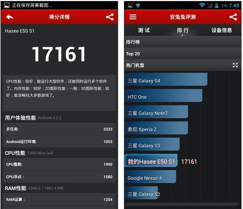 通过专业的安兔兔跑分测试软件,测试后,可以看到神舟E50安兔兔跑分在1.7万左右,与荣耀3C相当。这里大家也可以看到,2G运行内存相比荣耀1C并没有太大的区别,内存方面基本可以忽视。不过神舟E50内置16G存储,相比荣耀3C可以放置更多数据与安装更多应用,这个优势是不容忽视的。