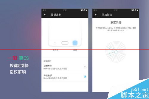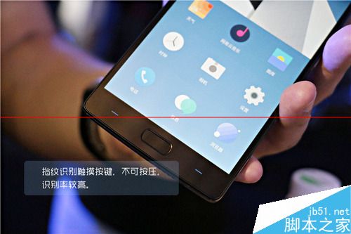 一加手机2正面下方采用了指纹触摸Home键+两枚虚拟背光按键的组合,Home键不可按压。除了指纹识别之外,可以点触返回主界面,开启和关闭下拉菜单。但是经过实际体验,下拉菜单部分需要进行连续点触,反应不够灵敏。
