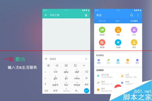 输入法部分采用了百度输入法一加专版,与氢OS做了相应的整合,操作与视觉效果都具有一致性。通话界面中我们也可以看到生活服务的分栏,整合了众多常用的APP,打车、美食、KTV等,较为实用。