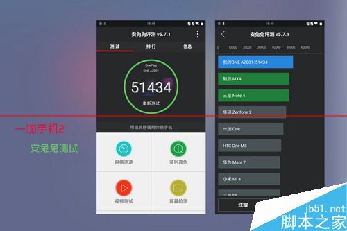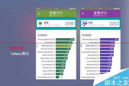 简单的跑分数据显示,一加手机2的分数虽然没有此前60000+的高分,但是51434的成绩也并不难看,分值在骁龙810处理器下属于正常水平。另外在高通的测试软件vellamo中,单核心高负荷的成绩与多核心共同运行处理的成绩与总成绩的表现较为吻合,各方面表现都比较稳定,并没有出现长短不一的现象,这里大家也可以通过排名具体感受下。