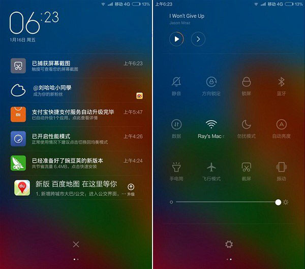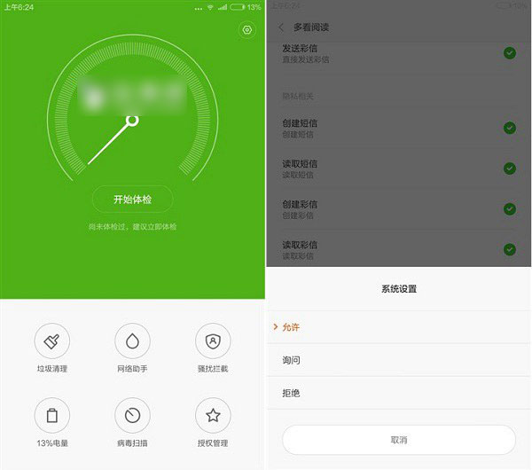 作为国内最成熟的手机系统,MIUI顶部下拉快捷键菜单,功能也相当丰富。此外小米Note运行的MIUI 6系统还内置了安全工具,可以方便用户随时清理垃圾,释放内存、拦截骚扰短信或者电话,如下图所示。