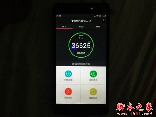 跑分上高通骁龙808自然跑分结果大家都比较清楚了,既然雷军提了我们也不避讳,使用安兔兔跑分给大家公布结果。测试版本为3GB内存高配版本。跑分结果为36625,确实要远超搭载615的4i。排在目前主流的Mate 7、一加、Note4等产品之后。