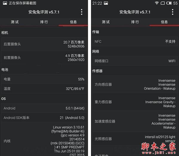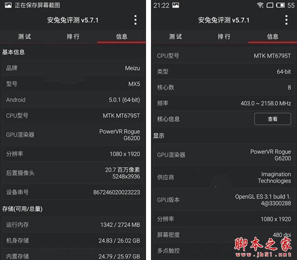 在对魅族MX5跑分测试之前,我们先来大致看看其硬件配置。魅族MX5采用557英寸1080P全高清屏幕,搭载2.2GhzHelio X10(MT6795T)八核处理器,运行3GB内存以及16GB/32GB/64GB存储空间,拥有后置置摄像头为2070万像素+前置500万像素摄像头,电池内置3150mAh容量,运行基于Android 5.0的Flyme 4.5系统,支持mCharge快速充电技术,通过大家最为熟悉的安兔兔V5.7.1版本测试跑分成绩如下: