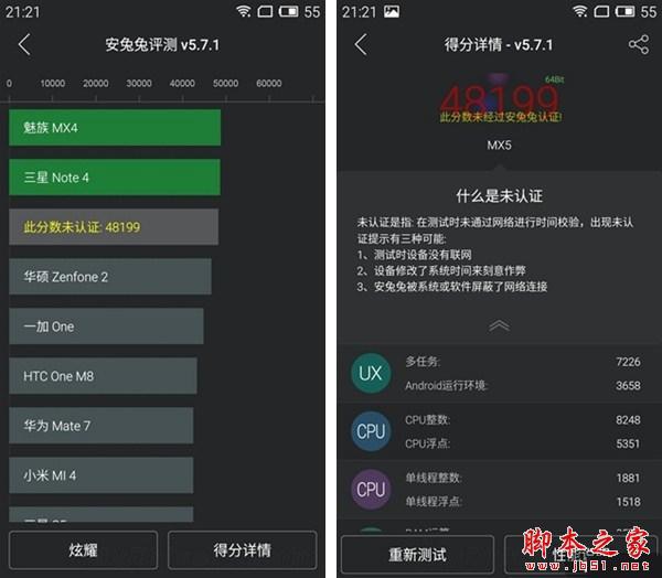 通过安兔兔跑分软件测试来看,魅族MX5安兔兔跑分实际成绩达到了48199分,这样的跑分成绩符合联发科MT6795T处理器和3GB运行内存的搭配组合,如下图所示: