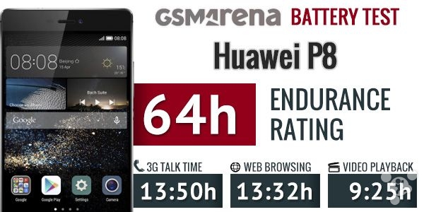 实际续航测试中,华为 P8 的通话时间为 13 小时 50 分、视频浏览时间为 9 小时 25 分、亮度 50% 的情况下网页浏览时间为 13 小时 32 分,其中进步最明显的是视频浏览,比 P7 足足多出了一个小时。