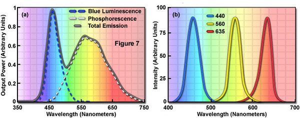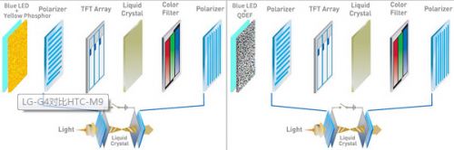 普通液晶(左)与量子点屏幕(右)结构与光谱对比