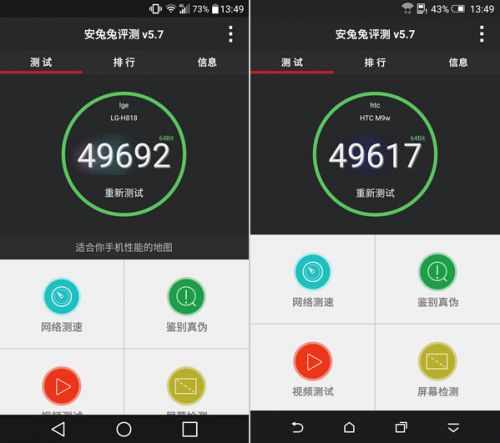 与安兔兔的结果一样,搭载骁龙808的G4又一次胜过了搭载骁龙810的HTC M9。虽然说两者的性能在目前的SoC市场来看都是顶尖的,但骁龙808的表现还是出乎笔者的意料。事实证明,定制版的骁龙808综合性能一点也不比骁龙810差,甚至更强。