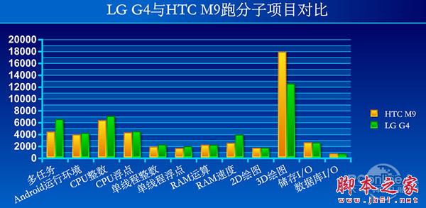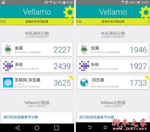 如果按照跑分的结果来看,骁龙808在其CPU部分的性能反而是超过骁龙810的,而仅仅只是在GPU以及I/O方面略微落后。为了验证这个结论,我们又用Vellamo对G4与M9进行了测试。