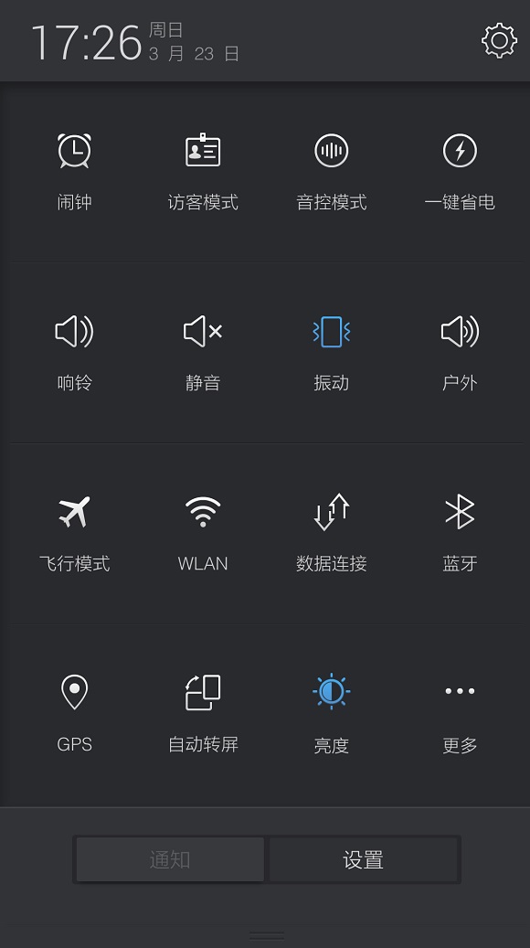 金立S5.5系统操作上比较简单易用,其顶部下拉菜单中有“通知"和各类快捷操作入口,如下图所示: