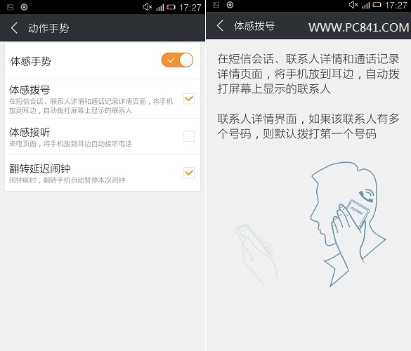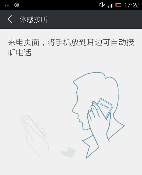 另外金立S5.5还支持体感接听功能,开启动作手势后,当有来电的适合,我们只要将手机放到耳边即可自动接听电话。