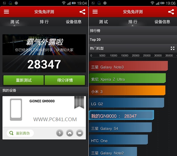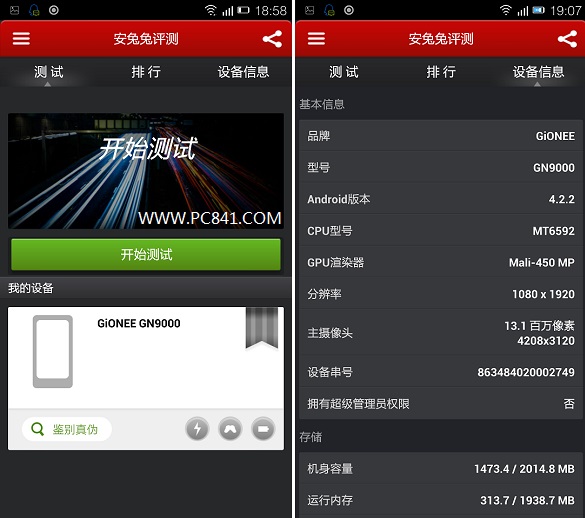 性能方面,金立S5.5尽管属于一款超薄手机,不过其内置的性能硬件还是不错的。金立S5.5搭载了1.7Ghz联科发MT6592真八核处理器,运行2G内存以及16G存储空间。接下来我们通过目前最受欢迎的安兔兔跑分软件,来检测一下金立S5.5的性能跑分如何。如下图,看到的是安兔兔检测金立S5.5硬件信息,其检测出的具体型号为GN9000。