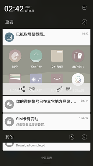 金立E8的下拉菜单只提供通知功能,所有的开关都没有在下拉菜单上,而Amigo3.1最新加入了上拉菜单功能,所有快捷开关都在上拉菜单里,这样的设计更贴合单手操作的需要
