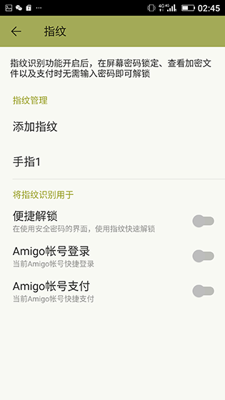 金立E8提供有指纹识别功能,只要在设置界面录入指纹就可以使用,但目前指纹识别只有提供指纹解锁、Amigo账号登陆和支付这三个功能,以后或许将会支持更多的指纹识别应用。